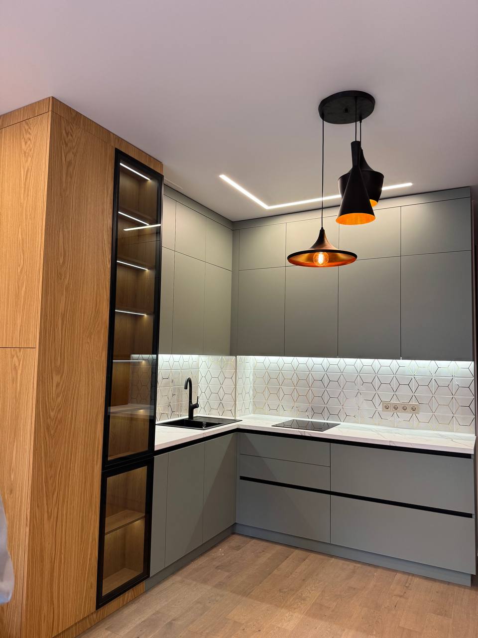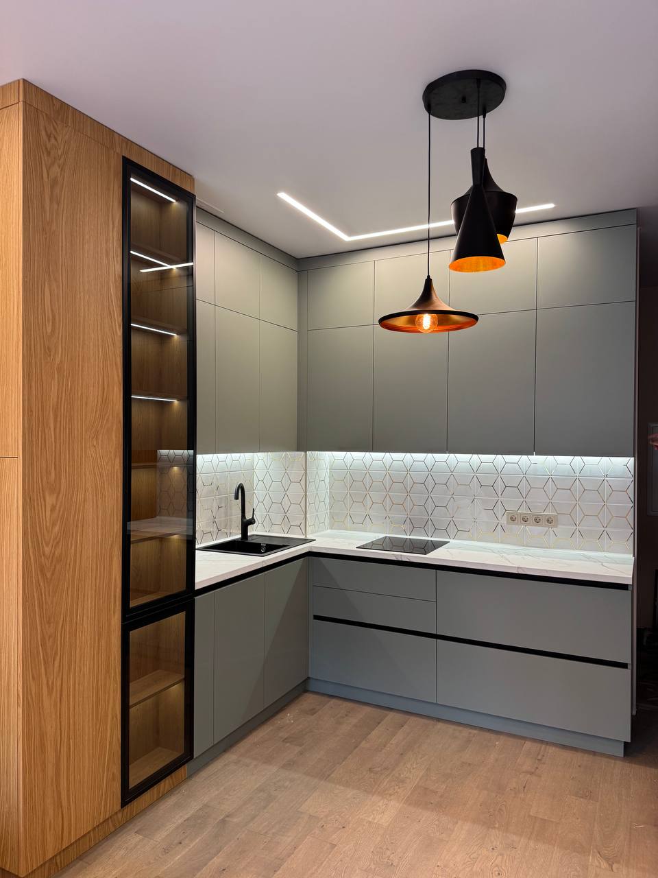 Серая угловая кухня с антресолями под потолок