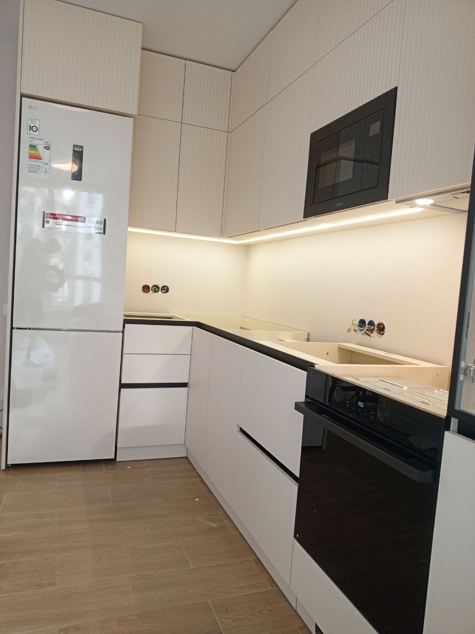 Белая угловая кухня под потолок